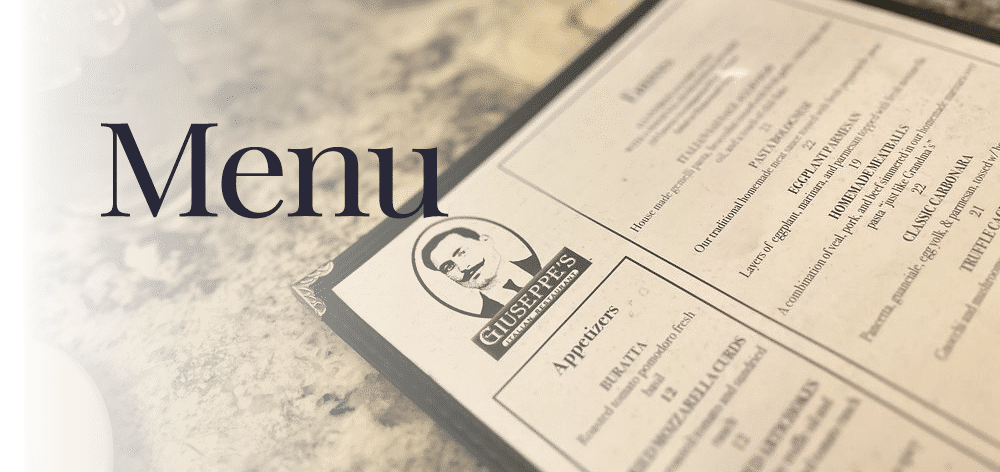 * Giuseppe’s prepares designated items as undercooked or raw per guest request. Consuming raw or undercooked meats, poultry, fish, shellfish, or eggs may increase your risk of foodborne illness, especially if you have certain medical conditions. Guests with food allergies should inform their server prior to ordering.