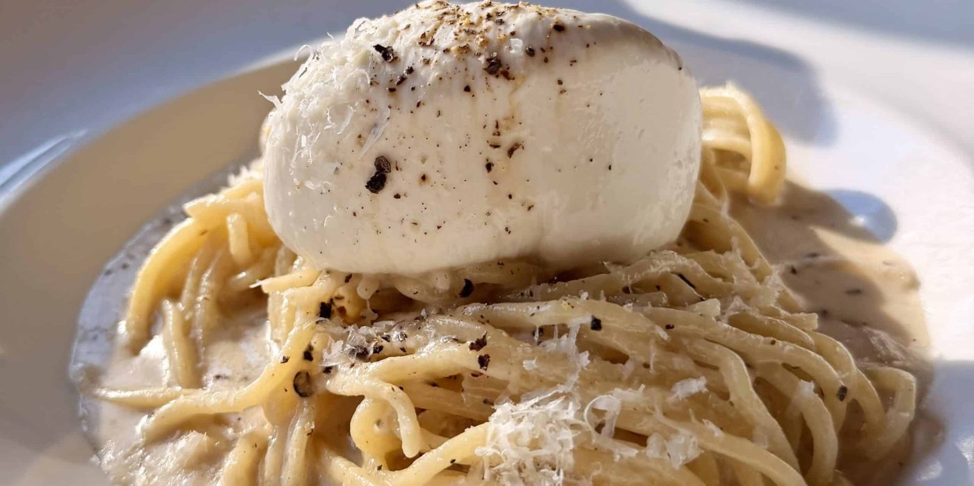 Homemade fresh spaghetti chitarra, pecorino romano, black pepper, burrata