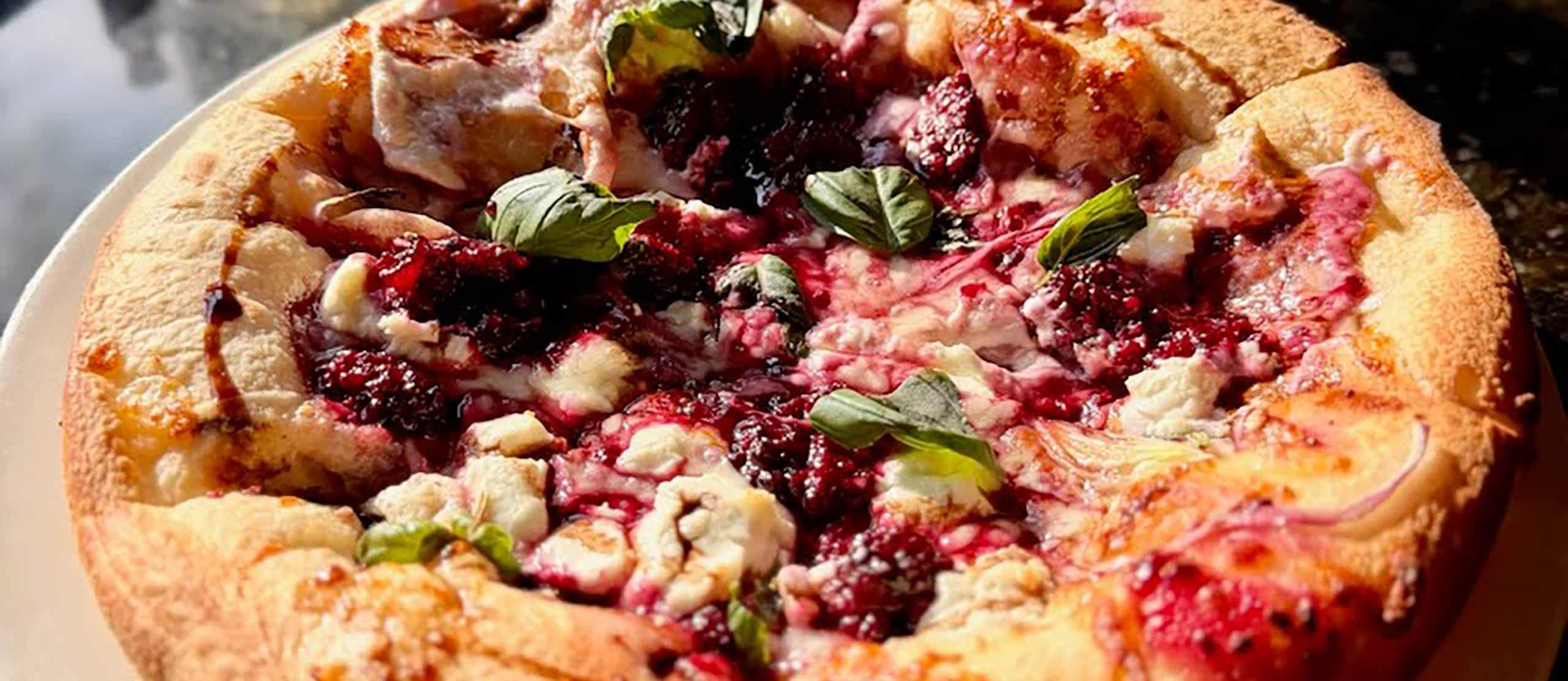 Shredded mozzarella, blackberry jam, goat cheese, crispy speck, red onion, fresh basil, honey balsamic