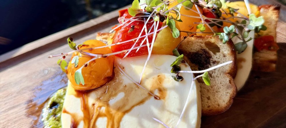 prosciutto infused focaccia, fresh mozzarella, heirloom tomato bruschetta, basil pesto, honey balsamic