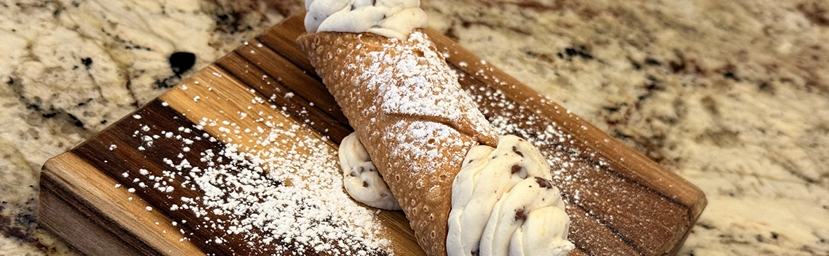Crisp pastry shell stuffed with chocolate studded sweet Italian cheese and dusted with sugar