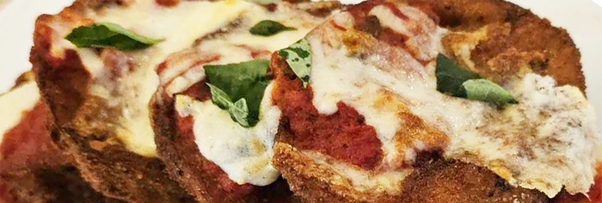 Layers of eggplant, marinara, and parmesan topped with fresh mozzarella